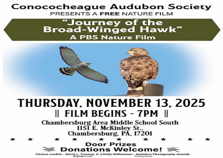 Exciting (free!) happenings in November from the Conococheague Audubon Society: Meeting Who: Kyle Rambo What: Big Year 2024 When: November 11th, Monday * 7:00 PM Where: St. Luke Evangelical Lutheran Church, 2695 Luther Dr., Chambersburg You do not need to be a member to attend. Film What: Journey of the Broad-winged Hawk, PBS The film depicts the migration of the broad-winged […]