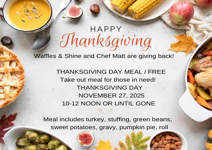 This season, our hearts are full Chef Pappy – Matt Kerr and Waffles & Shine are honored to partner together to serve our community with love and comfort. FREE Thanksgiving Day Meal For anyone in need of a hot meal, we welcome you with open arms. When: Thursday, November 27, 2025 * 10:00 AM – […]