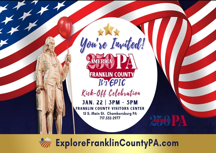 Franklin County 11/30 Visitors Center 15 South Main Street, Chambersburg, PAThursday January 22nd, 2026 * 3:00 PM - 5:00 PM You're invited to join us, along with the America250PA team, county officials, special guests, residents and community stake holders to […]