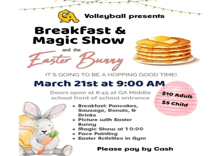 Saturday March 21st, 2026 * 9:00 AM (Doors Open at 8:45 AM) Greencastle Antrim Middle School entrance Pancakes, Sausage, Donuts, & drinks Picture with Easter Bunny Magic Show begins at 10:00 AM Face Painting Easter Activities in Gym $10 Adult | $5 Child - Please pay by Cash