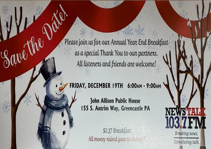 Friday December19th, 2025 * 6:00 AM - 9:00 AM $1.37 Breakfast ALL money raised goes towards a family in need this Holiday Season, as well as other local charities.