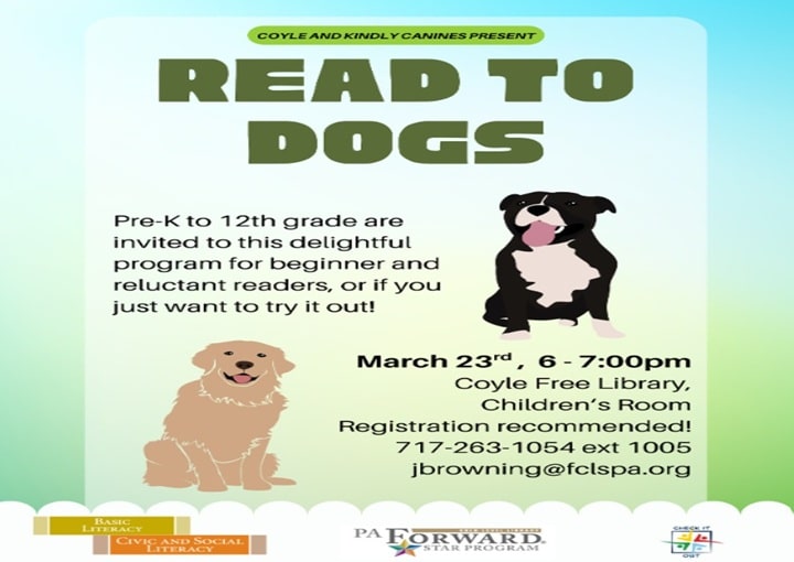 Monday March 23rd, 2026 * 6:00 PM - 7:00 PM Pre-K to 12th grade are invited to this delightful program for beginner and reluctant readers, or if you just want to try it out! Registration is recommended! 717.263.1054 ext 1005 | jbrowning@fclspa.org